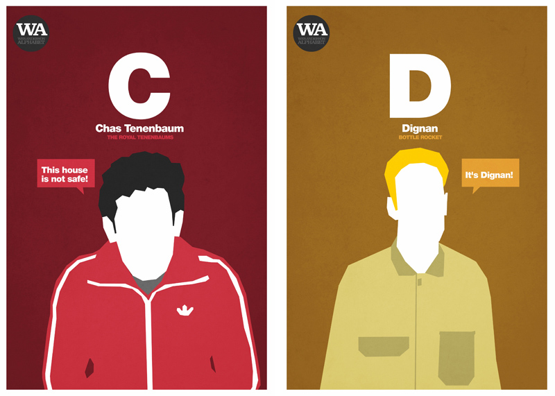 15 different posters take characters from Wes Anderson's films (from Bottle Rocket to The Royal Tannenbaums) and turn them into Alphabet posters with quips and quotes from the films:
